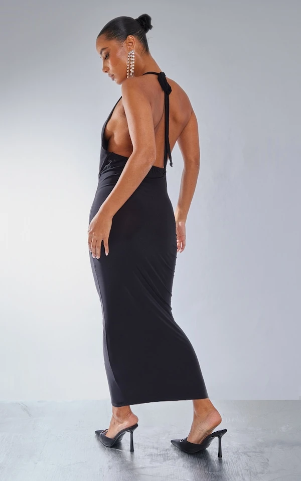 Robe mi-longue moulante noire à bretelles et col bénitier