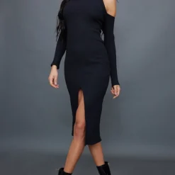 Robe mi-longue noire côtelée à épaules dénudées et fente