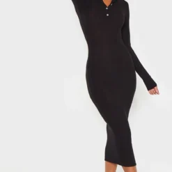 Robe mi-longue noire en maille côtelée brossée à boutons devant