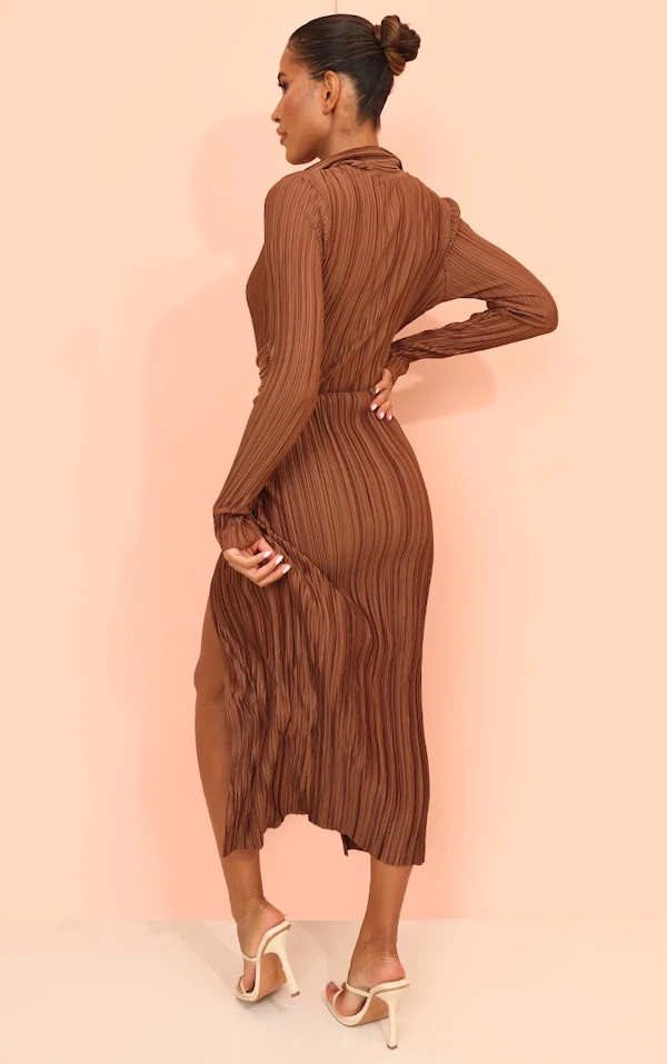 Robe mi-longue plissée chocolat à col et détail torsadé sur la taille