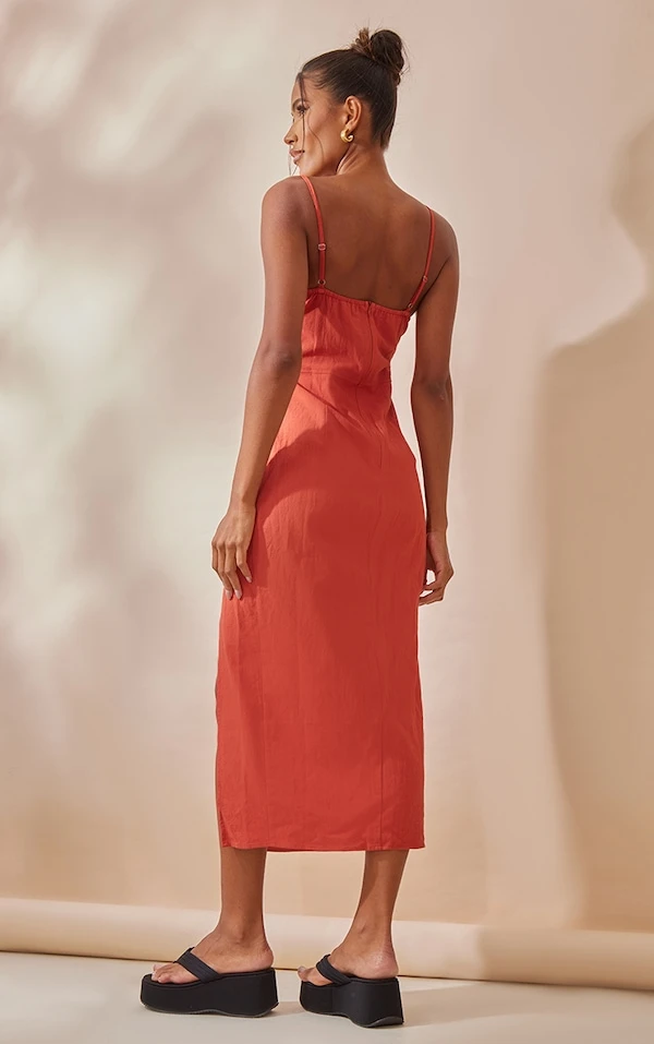 Robe mi-longue rouille fendue à corset et bretelles fines