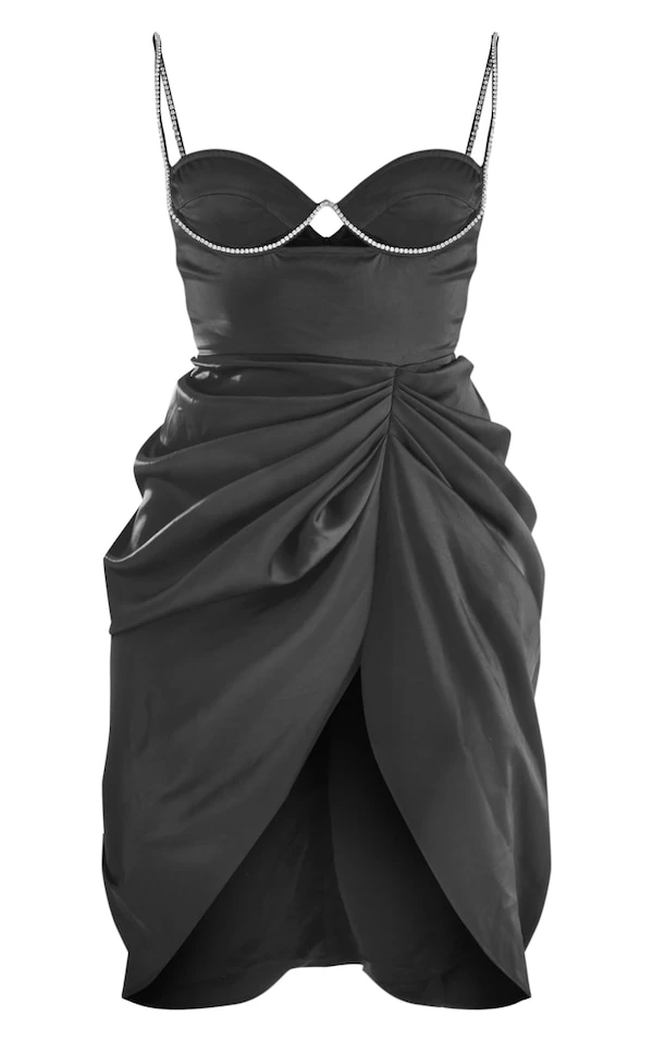 Glam à souhait cette robe à la coupe mi-longue. Son coloris noir est hyper facile à porter et on adore sa matière satinée de couleur noire et son design à armatures strassées. C’est si beau pour une soirée.