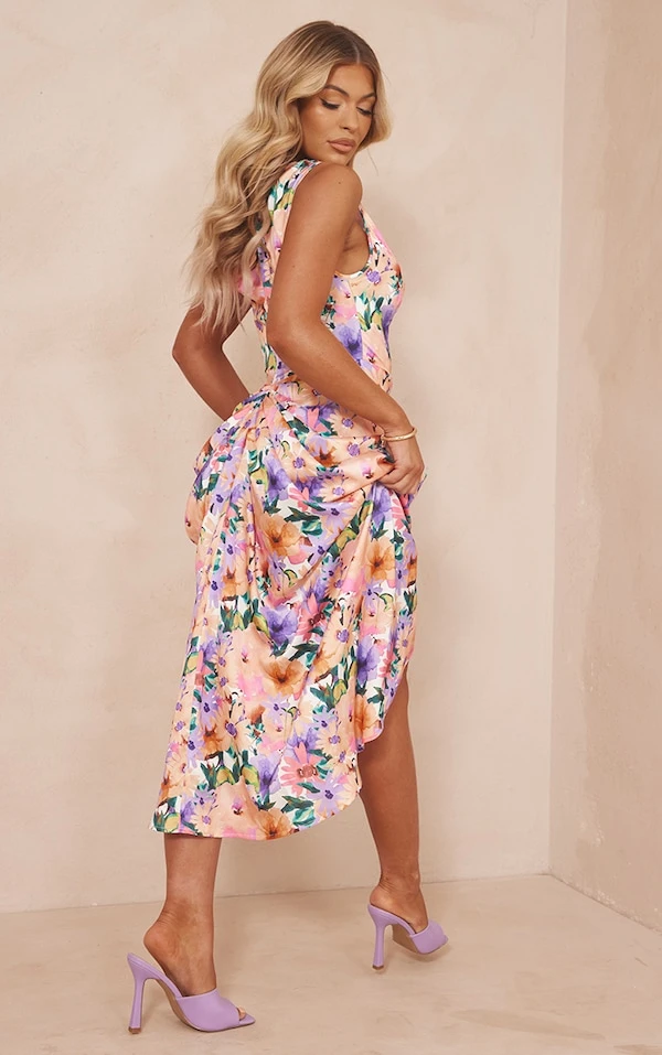 Robe mi-longue satinée fleurie multicolore à épaules dénudées et jupe drapée