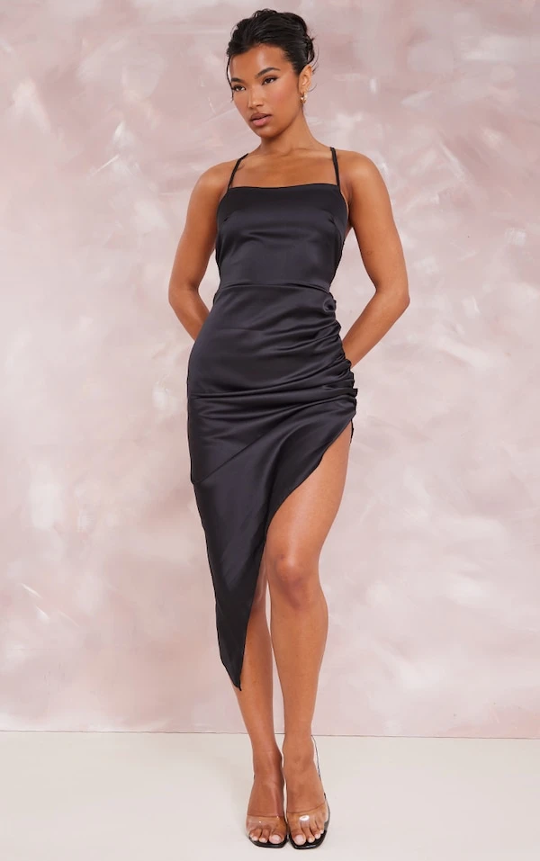 Robe mi-longue satinée noire à bretelles lacées dans le dos