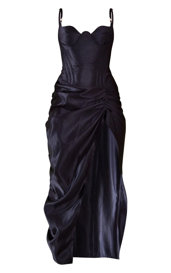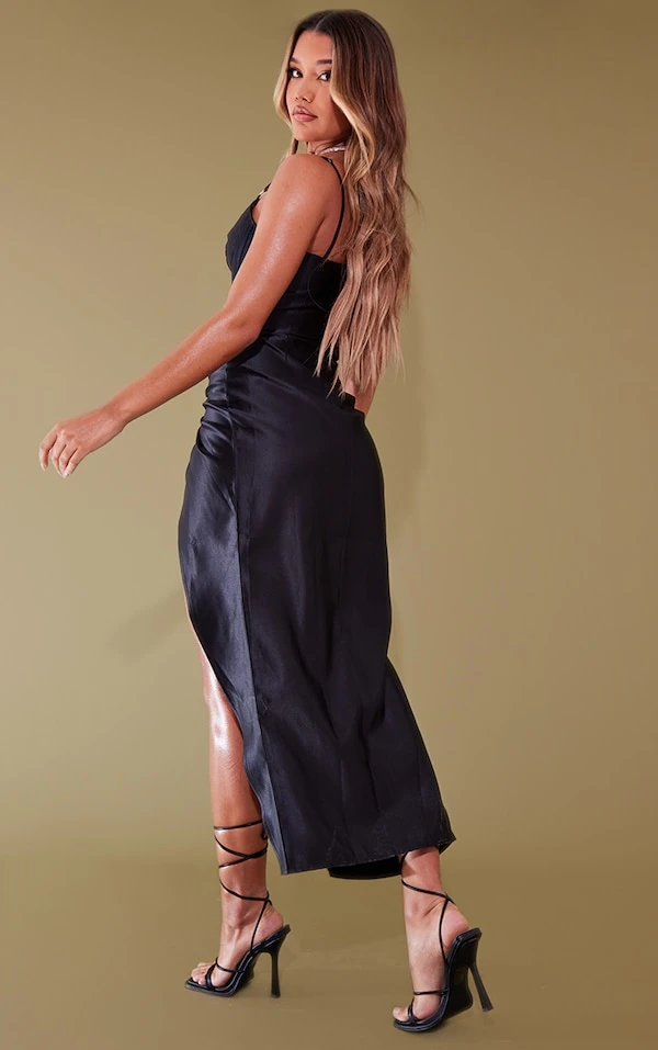 Trop stylée la robe ! On adore sa matière satinée so luxe, son coloris noir et son design à corset et à jupe froncée. Plus qu’à enfiler une paire de talons lacés et une paire de créoles dorées. Vous êtes prête pour votre soirée.