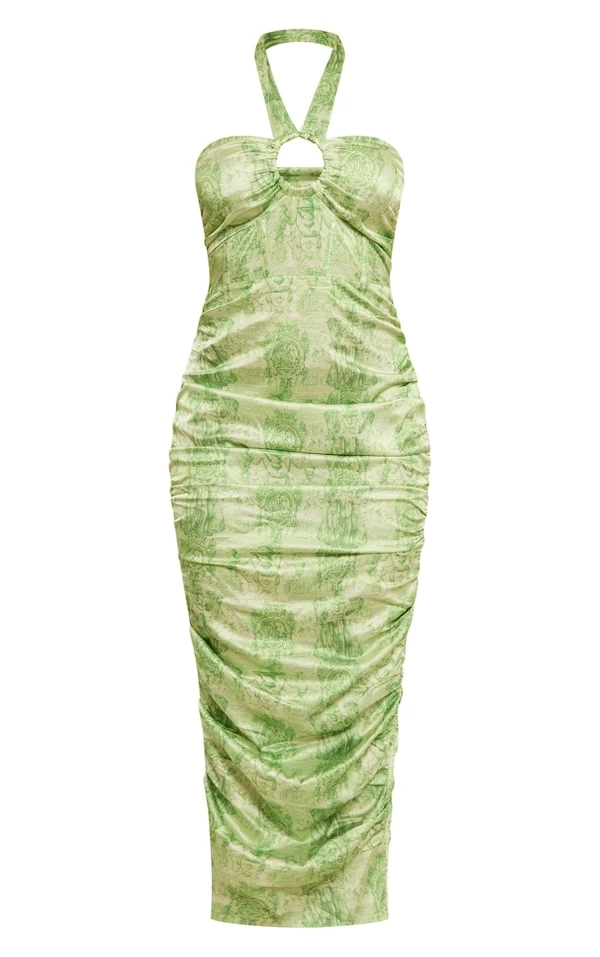 Robe mi-longue satinée vert citron imprimé renaissance à corset et anneau