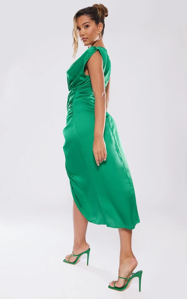 Robe mi-longue satinée vert émeraude à décolleté plongeant et jupe drapée