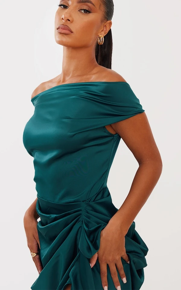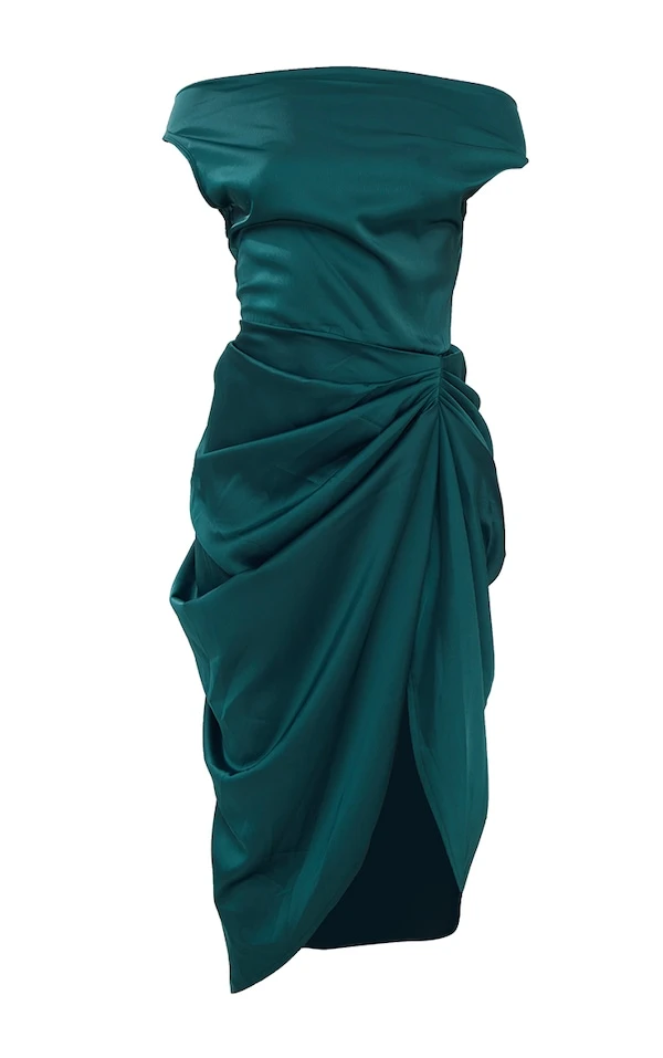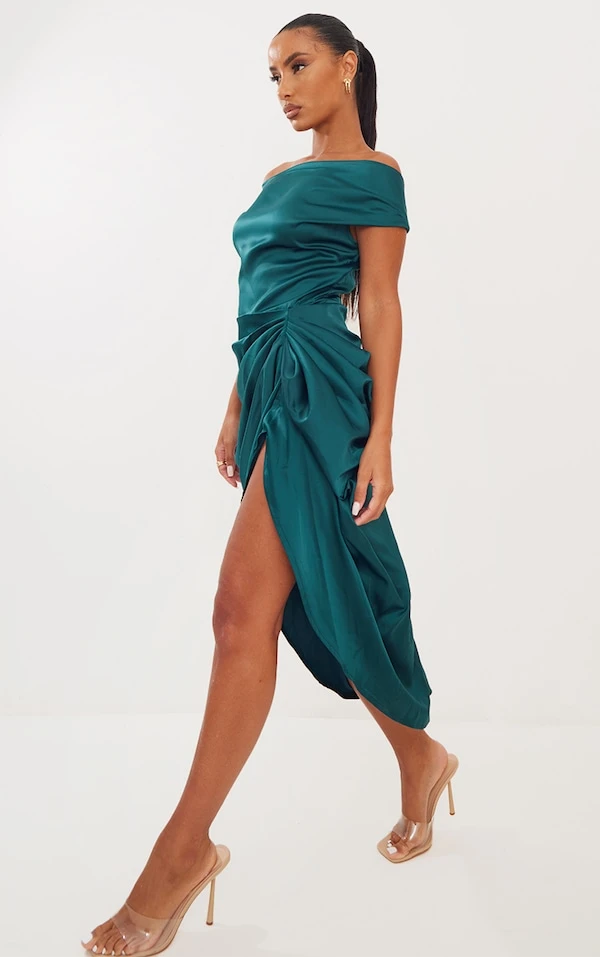 Robe mi-longue satinée vert émeraude à épaules dénudées et jupe drapée