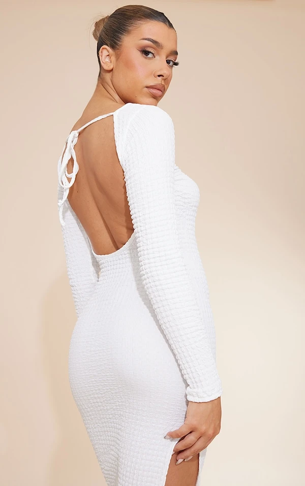 Robe mi-longue texturée blanche à manches longues et dos ouvert
