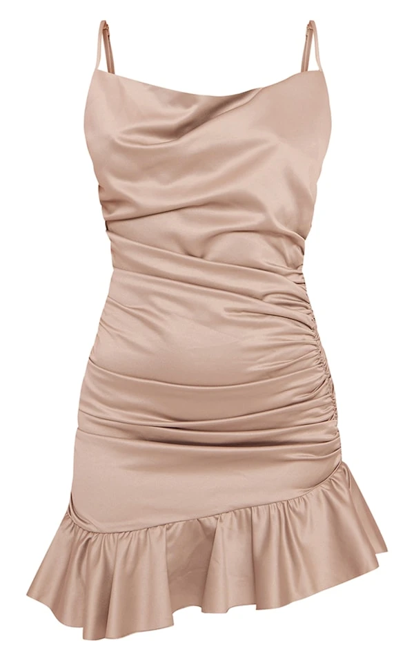 Robe moulante à bretelles mauve satiné à col bénitier et ourlet volanté