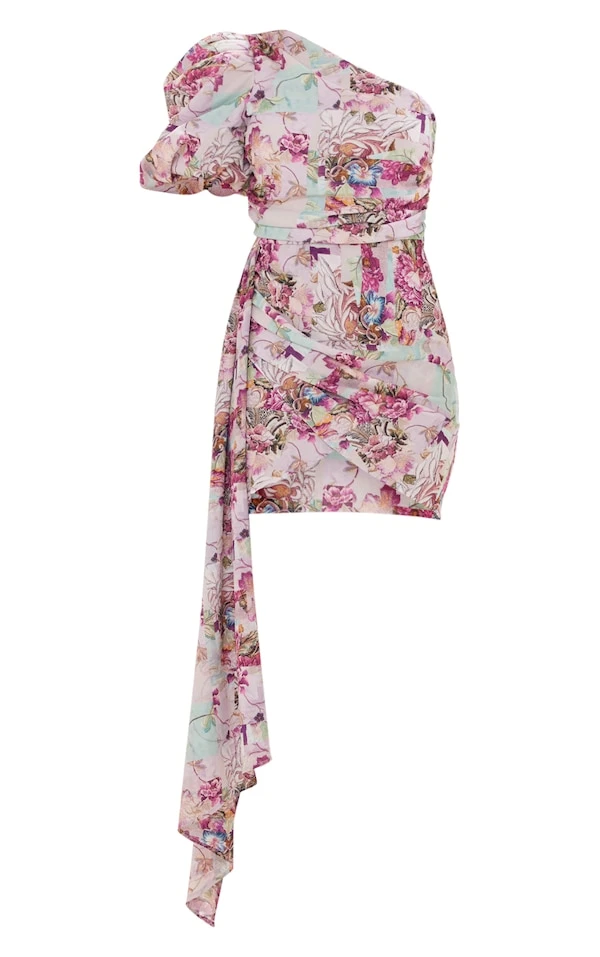 Robe moulante asymétrique rose fleurie abstraite drapée à manche bouffante