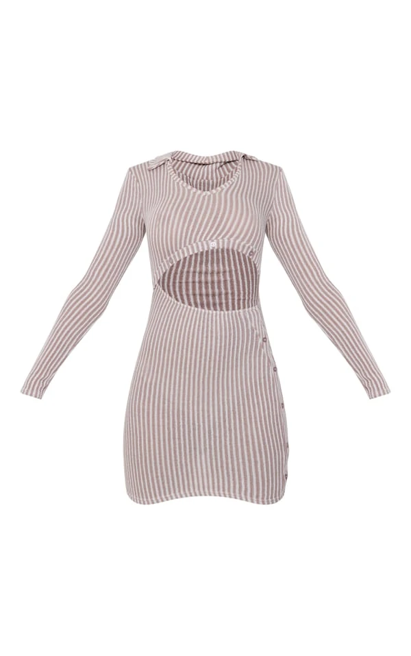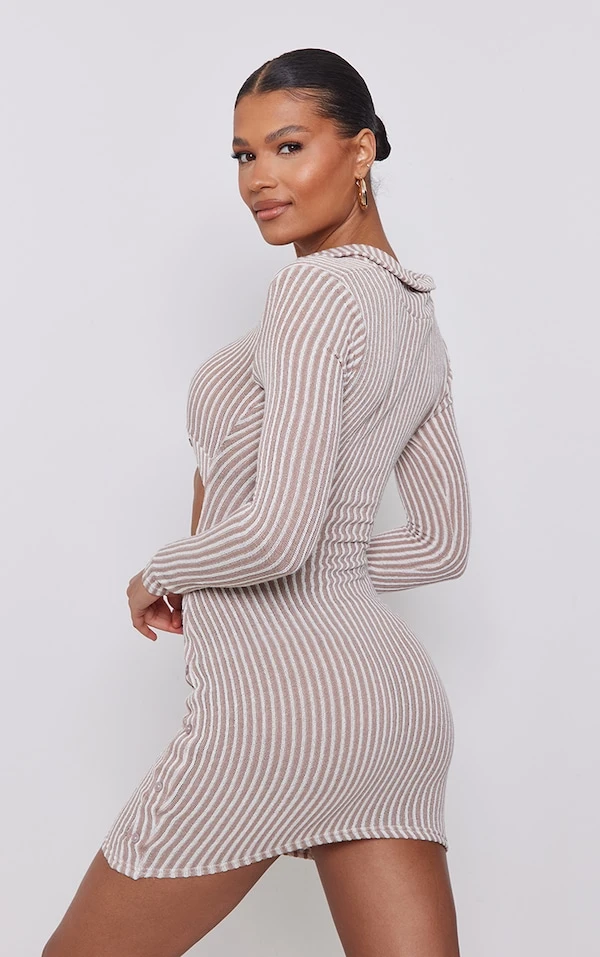 Robe moulante boutonnée en maille côtelée marron à rayures et col