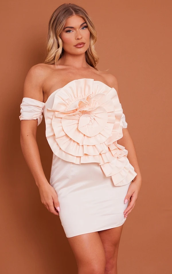 Robe moulante bustier crème structurée à détail rose satinée
