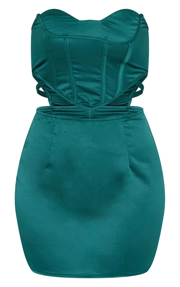 Robe moulante bustier satinée vert émeraude à corset découpé