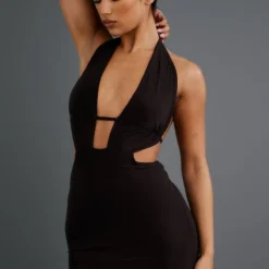Robe moulante chocolat froncée à dos nu et détail sur le buste