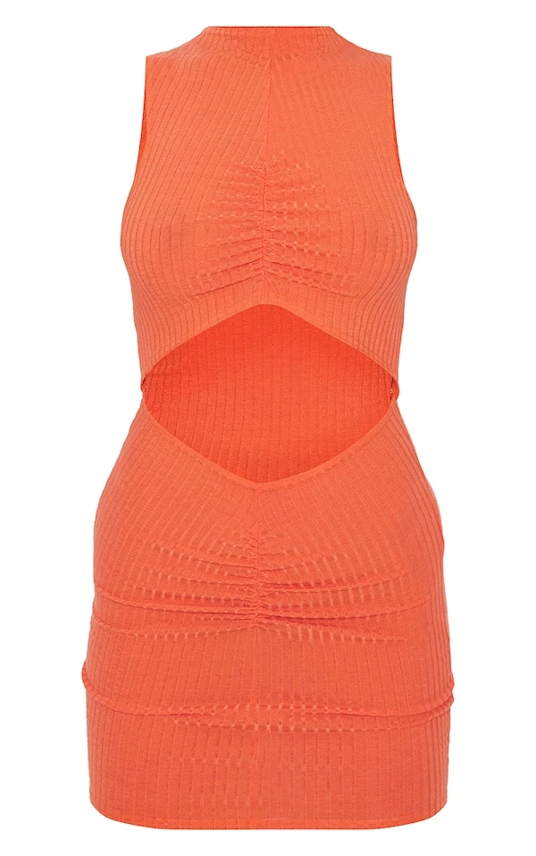Robe moulante côtelée froncée orange brûlé à taille découpée