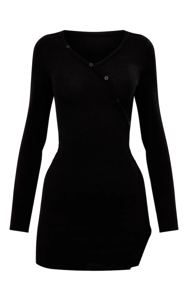 Robe moulante côtelée noire à boutons asymétriques