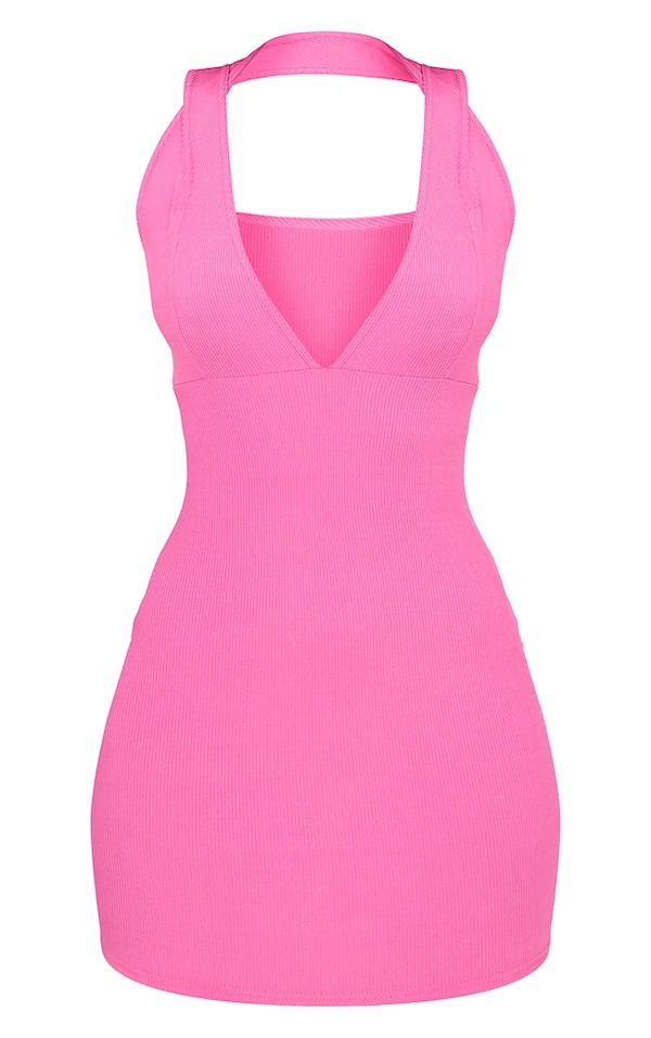 Robe moulante côtelée rose à décolleté plongeant et bretelles
