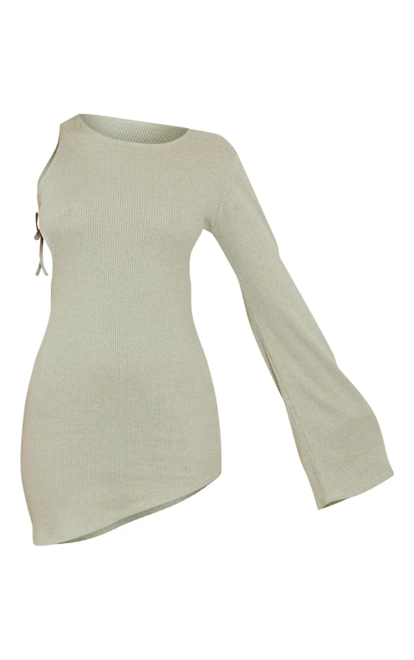 Robe moulante côtelée vert sauge asymétrique à manche flare