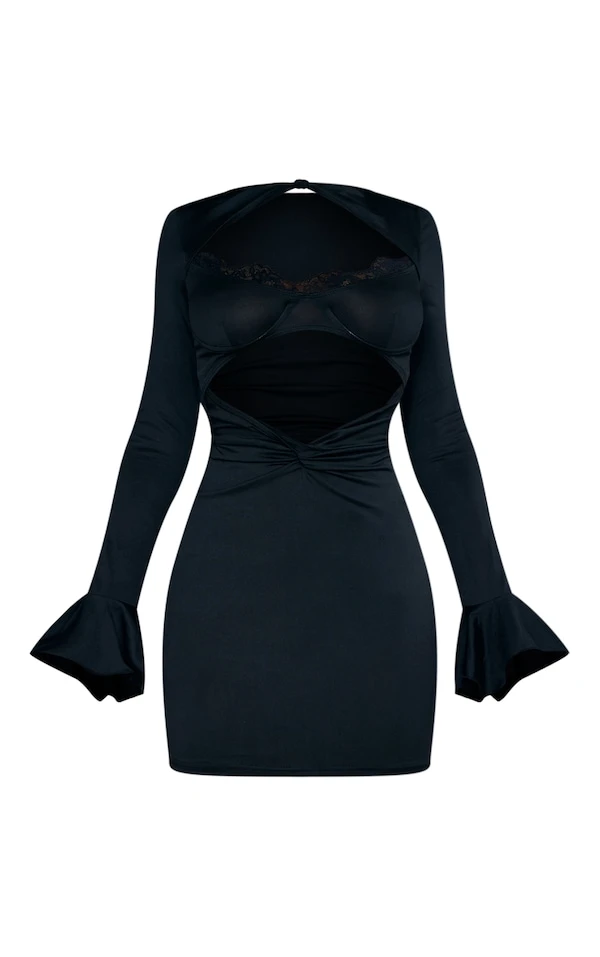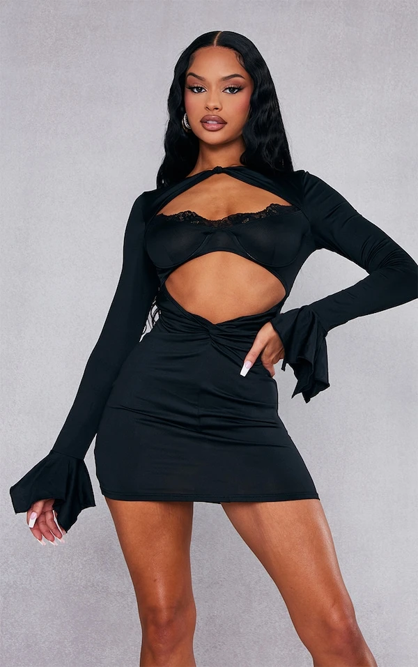 Robe moulante découpée noire à manches évasées et bonnets à bordure de dentelle