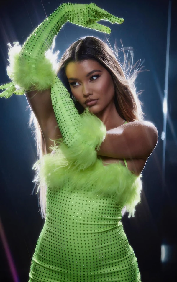 Totalement fans de cette robe à la coupe moulante flatteuse. Avec sa couleur acidulé vert citron, son design à sequins et à gants et le détail de ses plumes, on l’adore. Pour se démarquer en soirée, on la porte avec une paire de mules et quelques accessoires. Easy, vous ne trouvez pas ?