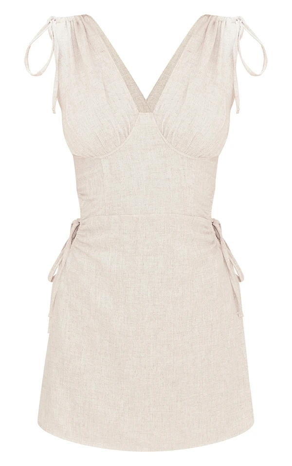 Robe moulante effet lin froncé gris pierre à découpes et armatures
