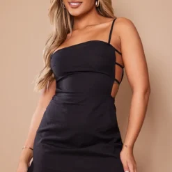 Robe moulante effet lin noire à lanières sur les côtés