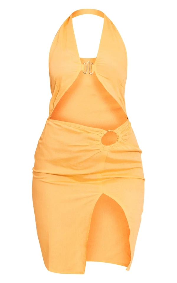 Robe moulante effet lin orange découpée à dos nu et empiècement