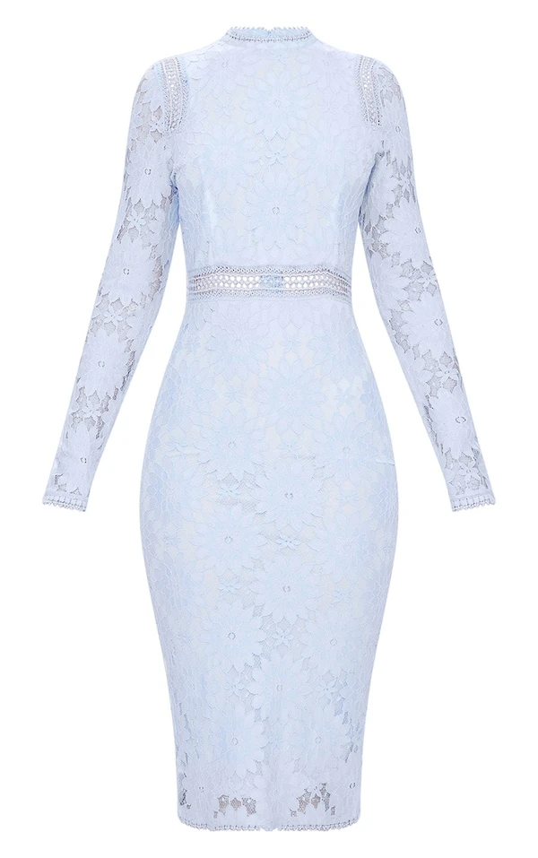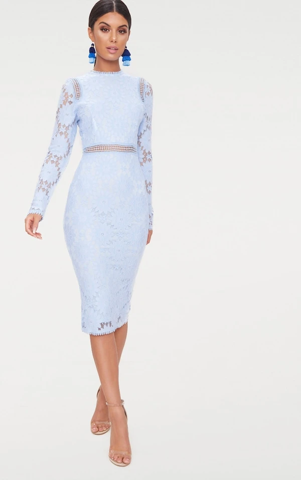 Cette superbe robe moulante trop mimi est parfaite pour une occasion spéciale. En dentelle bleu poudré avec des manches longues et une coupe moulante flatteuse, portez-la avec une paire de talons à brides et un sac pochette.