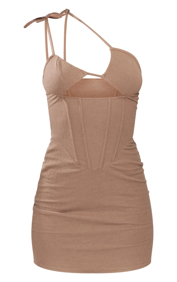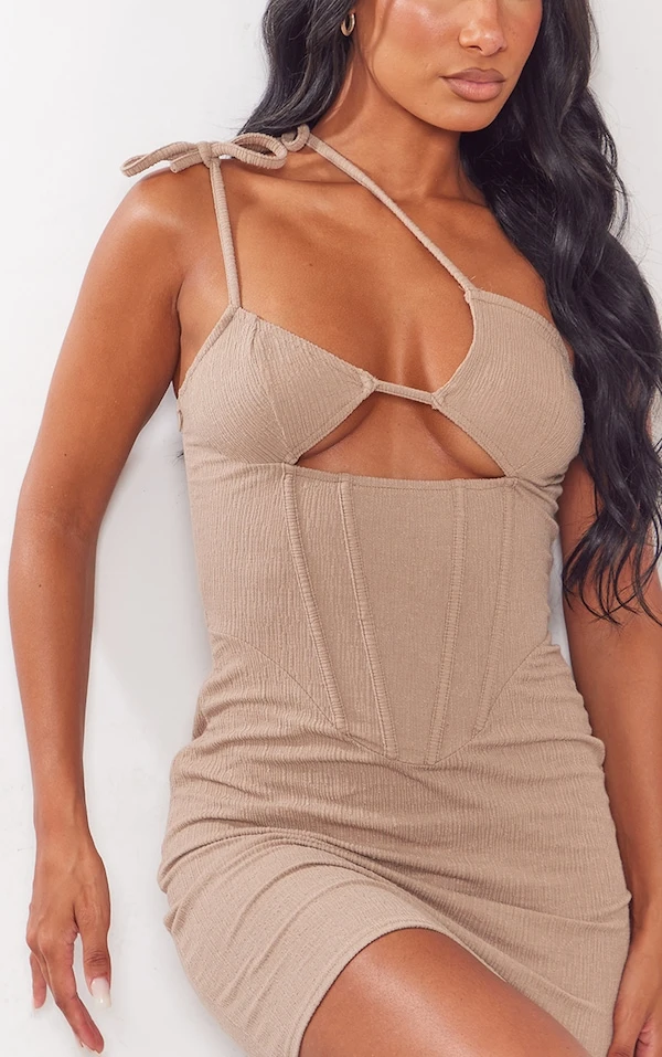 Robe moulante en jersey texturé taupe à corset et bretelles