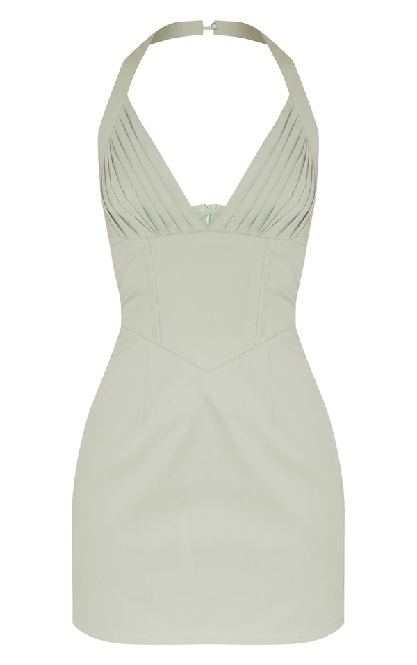 Robe moulante en maille tissée vert sauge kaki à bonnets plissés et dos nu