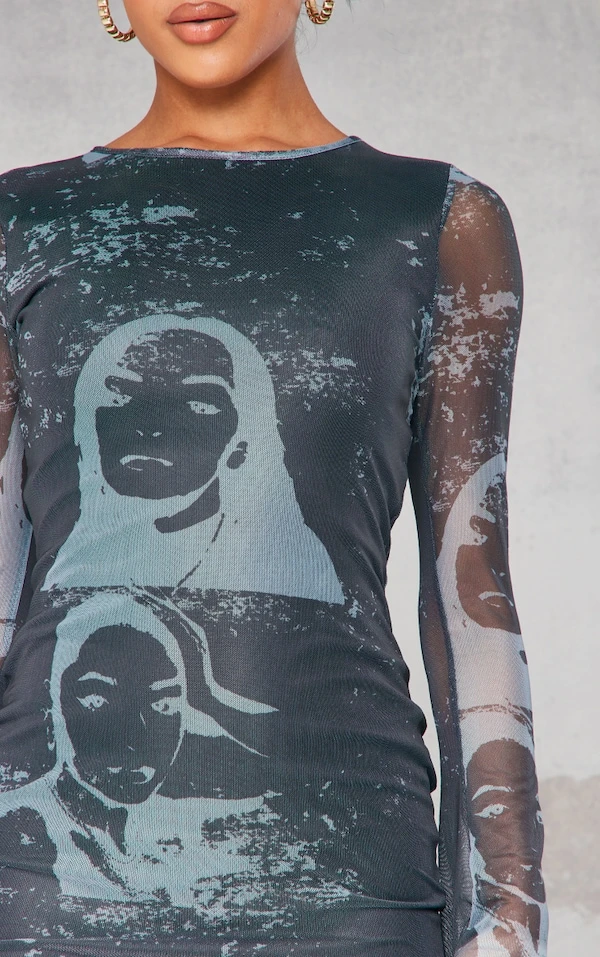 Robe moulante en mesh à imprimé visage gris anthracite et manches longues
