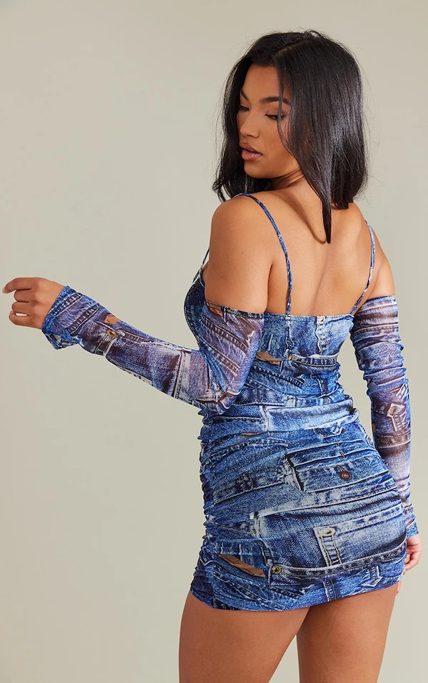 Robe moulante en mesh bleu imprimé jean à épaules dénudées