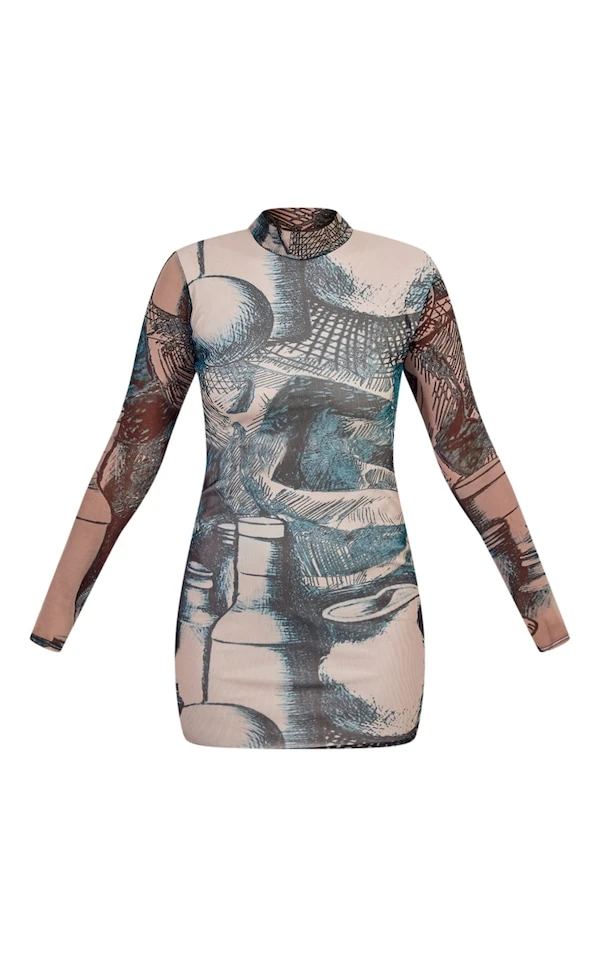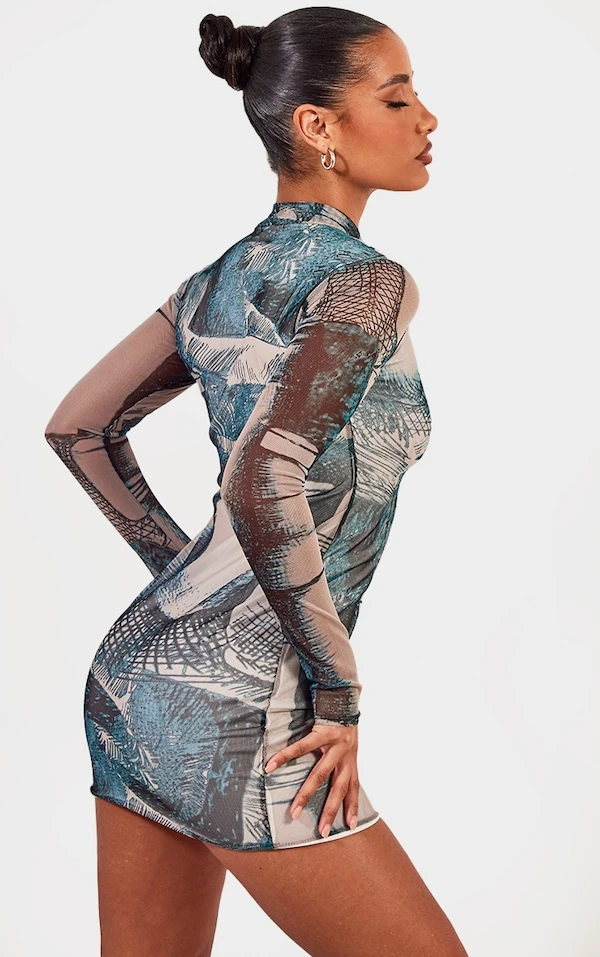 Robe moulante en mesh froncé vert imprimé abstrait à manches longues