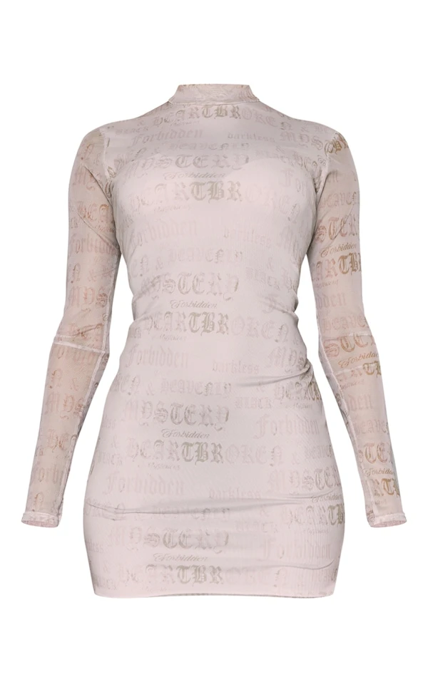 Robe moulante en mesh gris pierre imprimé gothique à manches froncées en mesh