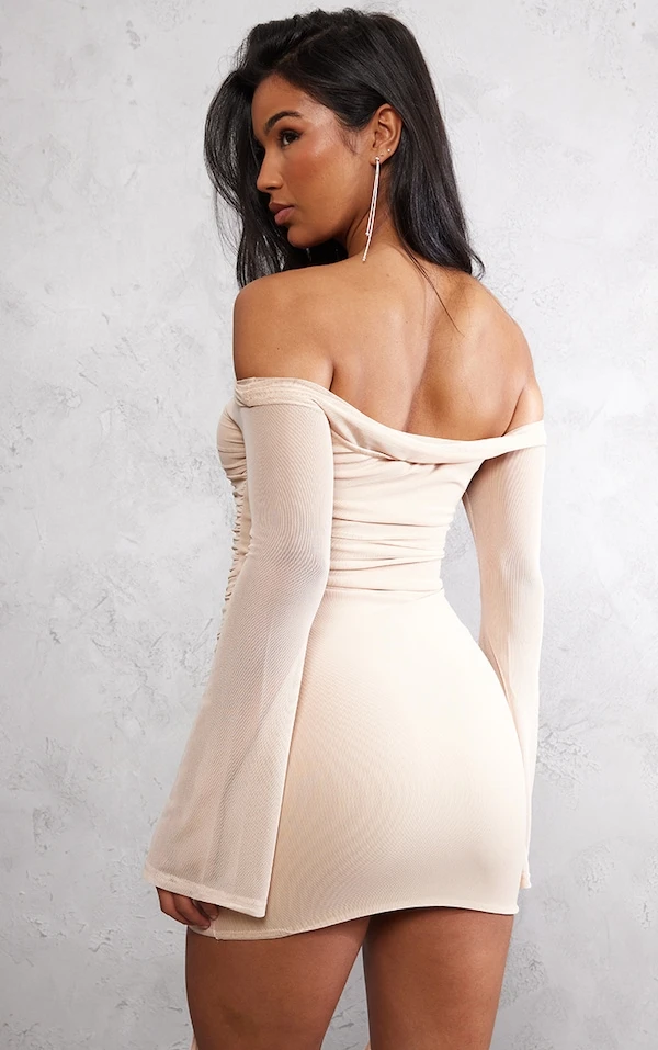 Robe moulante en mesh gris pierre très froncée à col bardot
