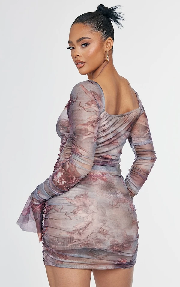 Robe moulante en mesh imprimé Renaissance multicolore froncé à barre en V