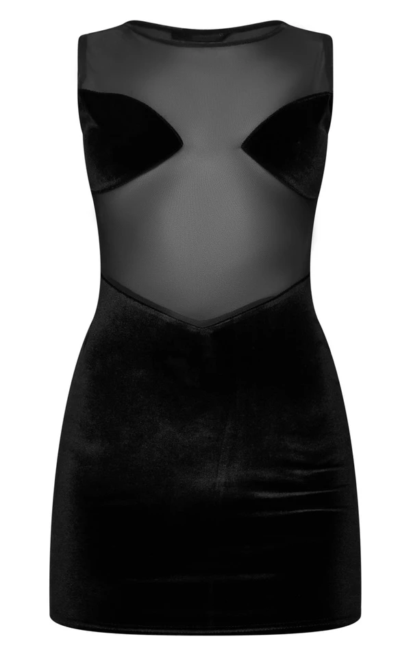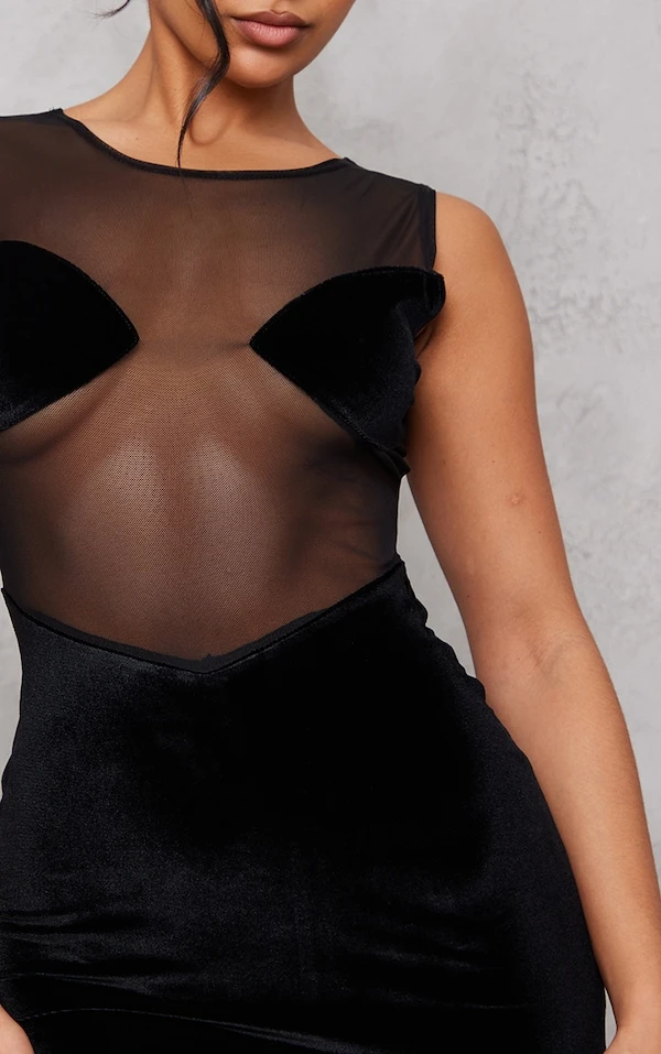 Robe moulante en mesh noir sans manches à détail bonnets en velours