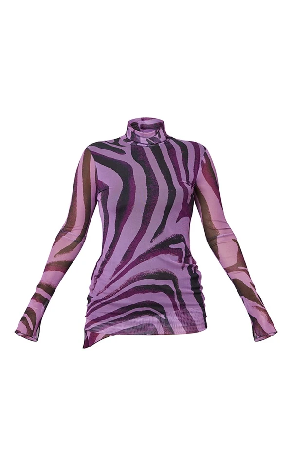 Robe moulante en mesh violet imprimé zèbre à ourlet légèrement volanté