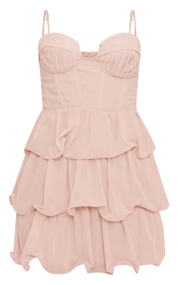 Robe moulante en mousseline de soie rose plissée à volants et détail bonnets