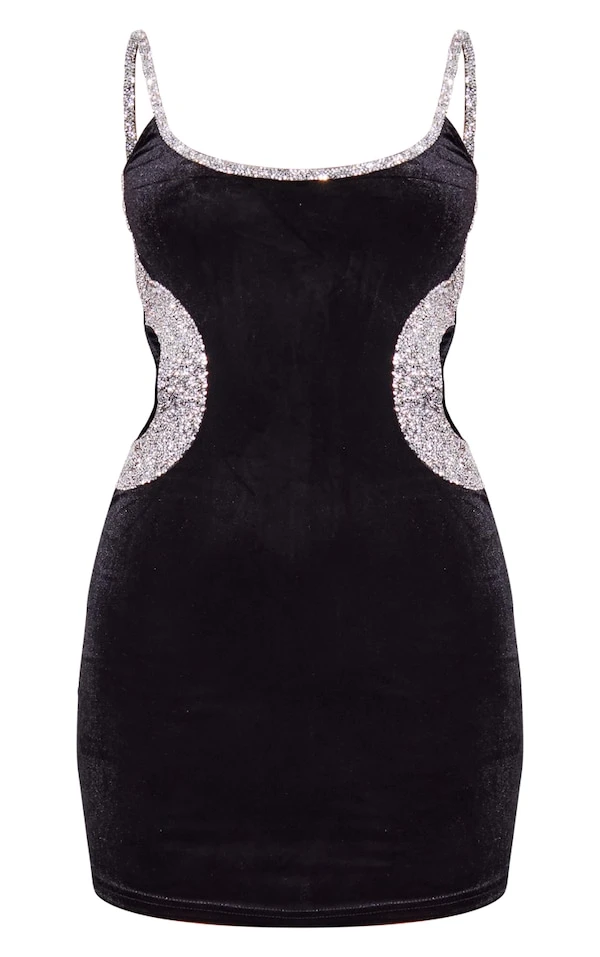 Robe moulante en velours noir à bordure strassée et bretelles