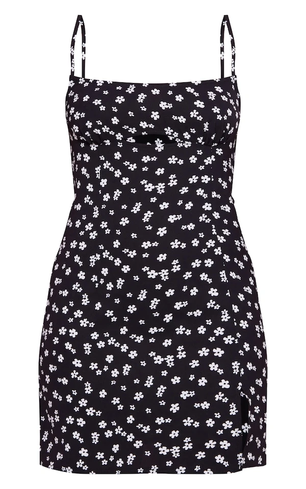 Robe moulante fendue tissée noire à imprimé petites fleurs et découpe