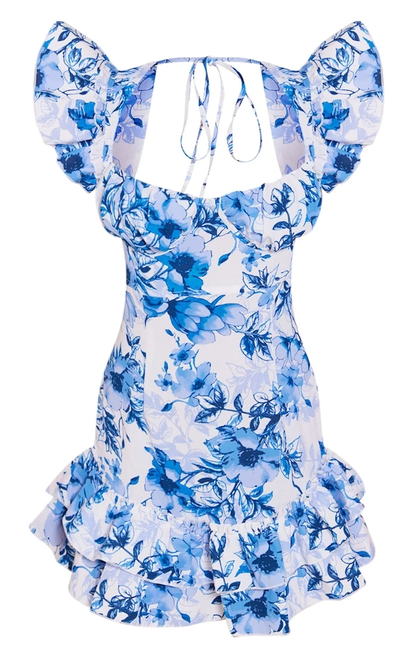 Robe moulante fleurie bleue à armatures et bretelles volantées dans le dos
