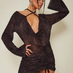 Robe moulante floquée chocolat à fronces et col bénitier détail noué