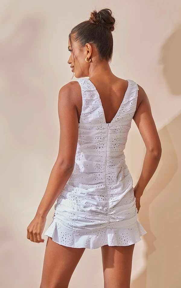 Robe moulante froncée blanche brodée à décolleté et ourlet volanté