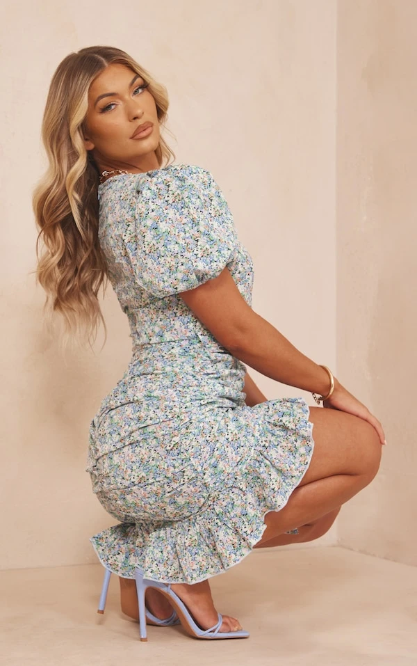 Robe moulante froncée bleue fleurie en mousseline de soie à manches courtes bouffantes