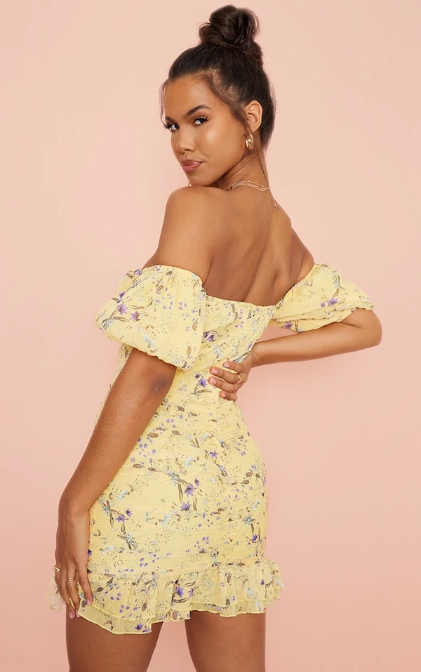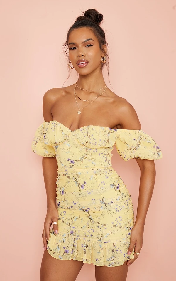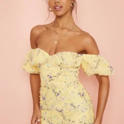 Robe moulante froncée en mousseline de soie jaune fleurie à col bardot et manches bouffantes