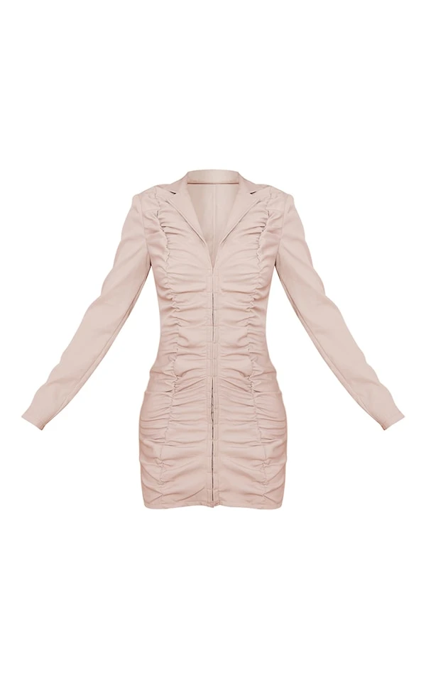 Robe moulante froncée gris pierre à agrafes et détail revers