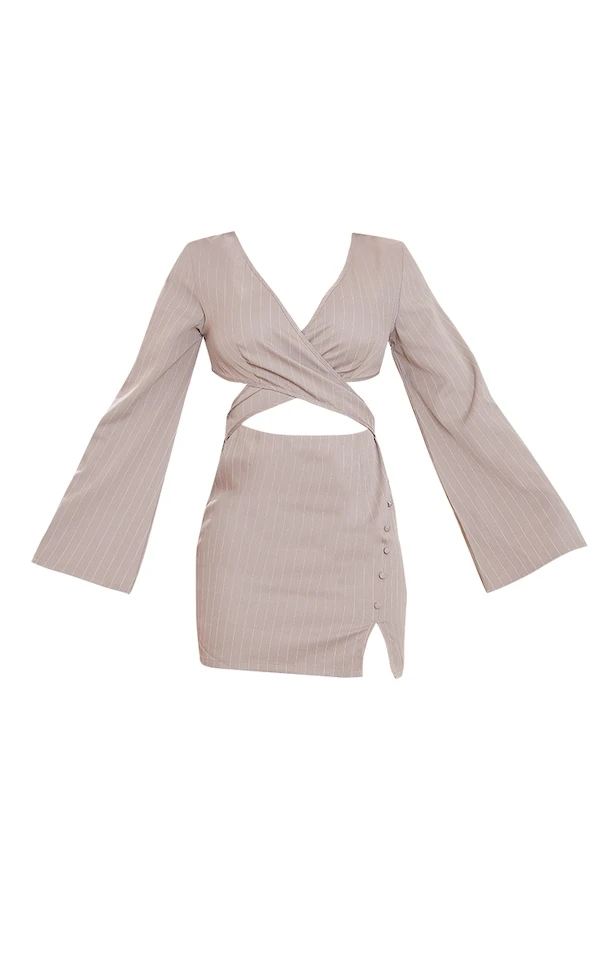 Robe moulante gris pierre à fines rayures croisée sur le devant à manches longues et boutons