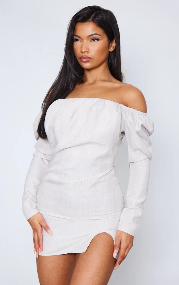 Robe moulante gris pierre effet lin plissée à liserés et col bardot